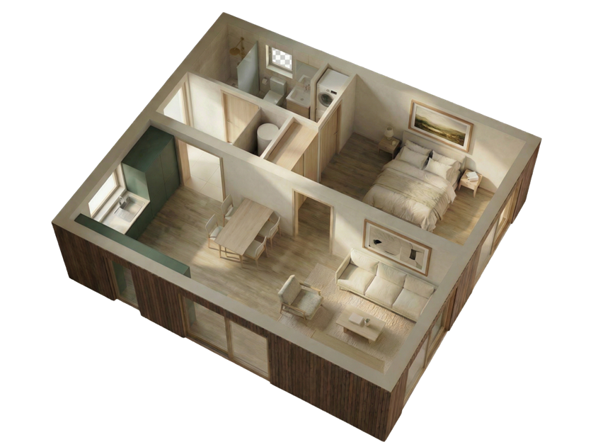 The Compact Family Home has been carefully designed to deliver everything needed for comfortable day-to-day living within a 45sqm layout. The single bedroom , an open-plan central living space, a full bathroom and integrated utility space are arranged to make the home feel bright, practical and surprisingly spacious.
